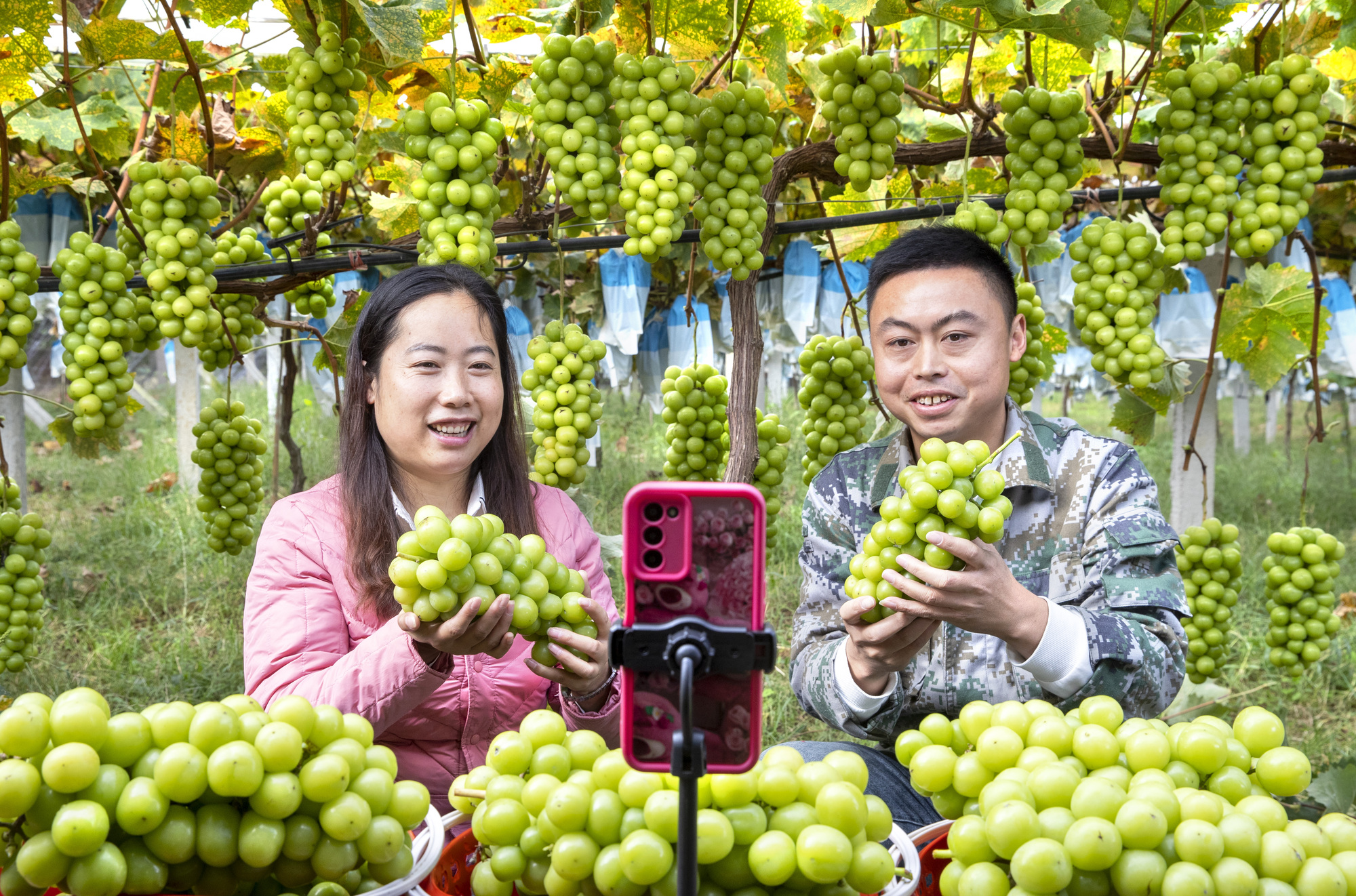村民在果园里直播售卖阳光玫瑰葡萄(史开心摄)