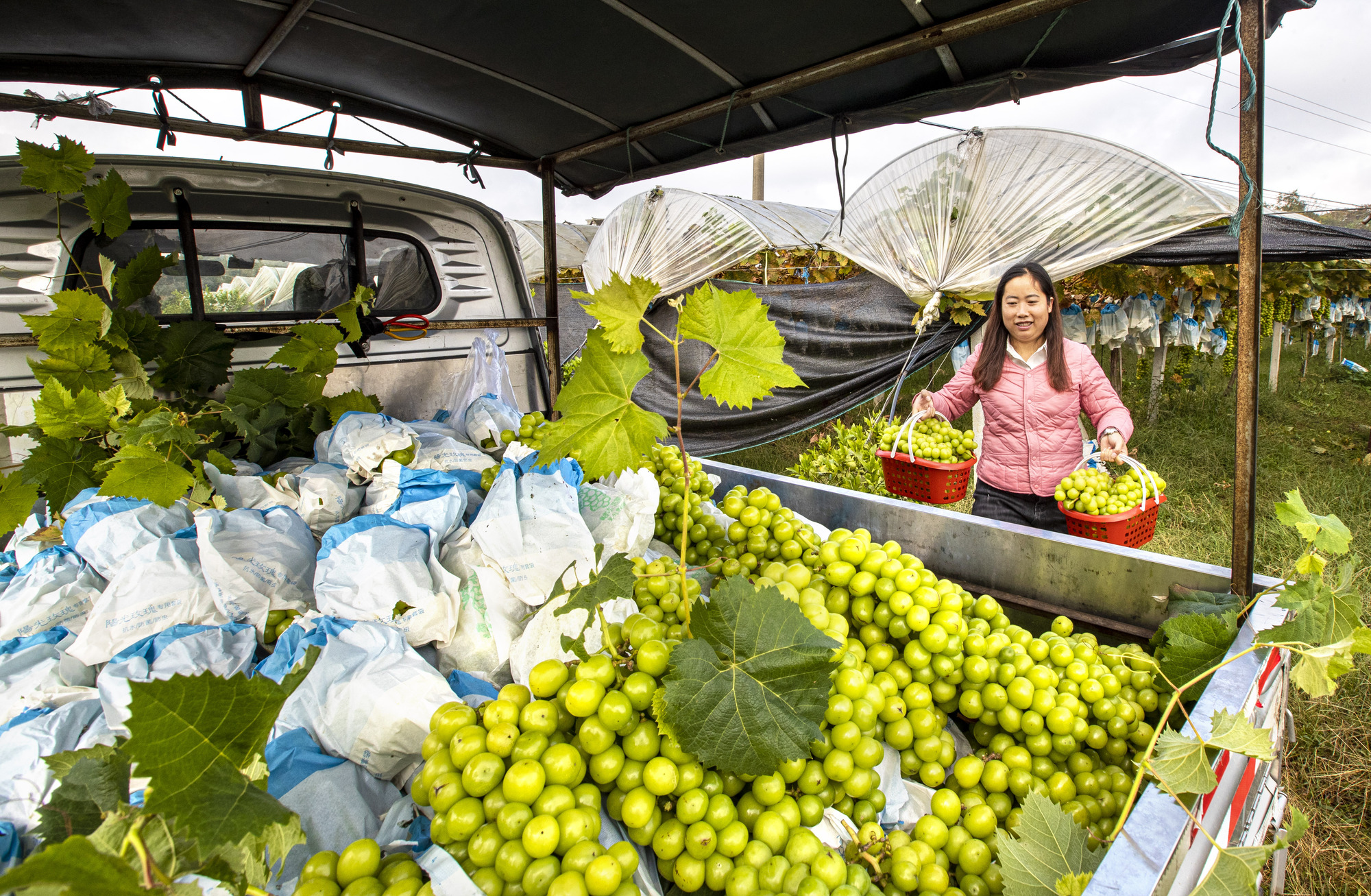 霜降时节,地处乌蒙山区的贵州省黔西市洪水镇精品果园里一片繁忙,村民采摘成熟的阳光玫瑰葡萄供应市场。