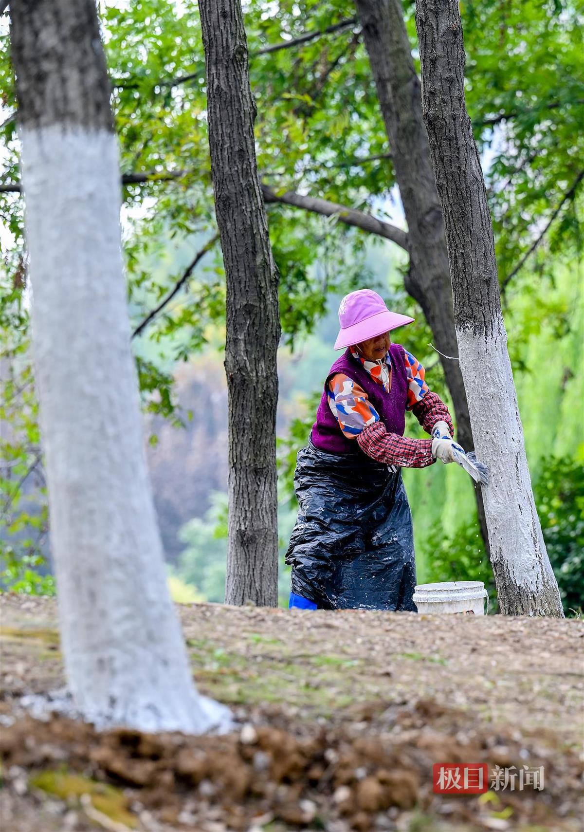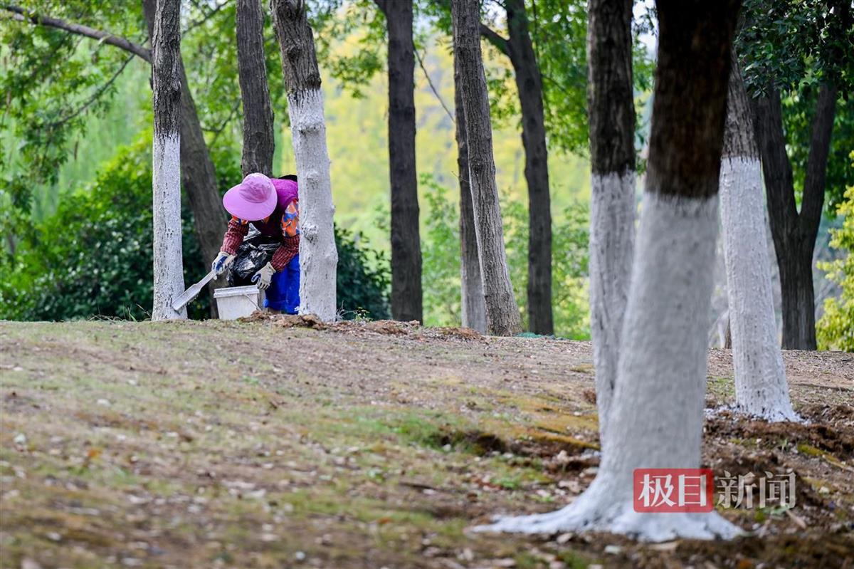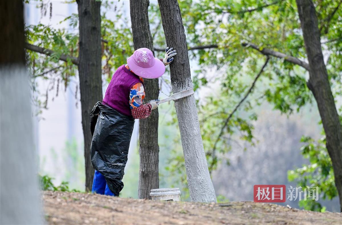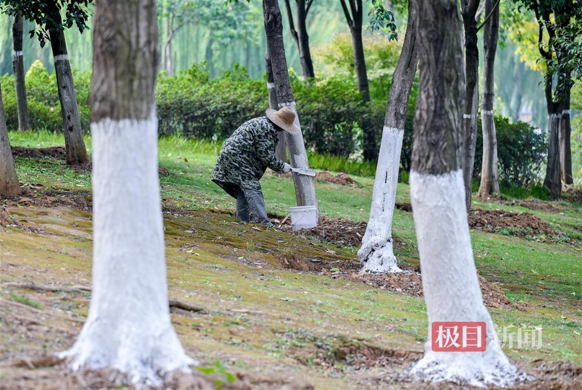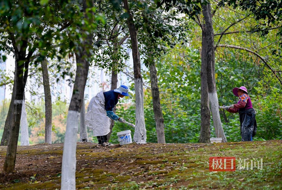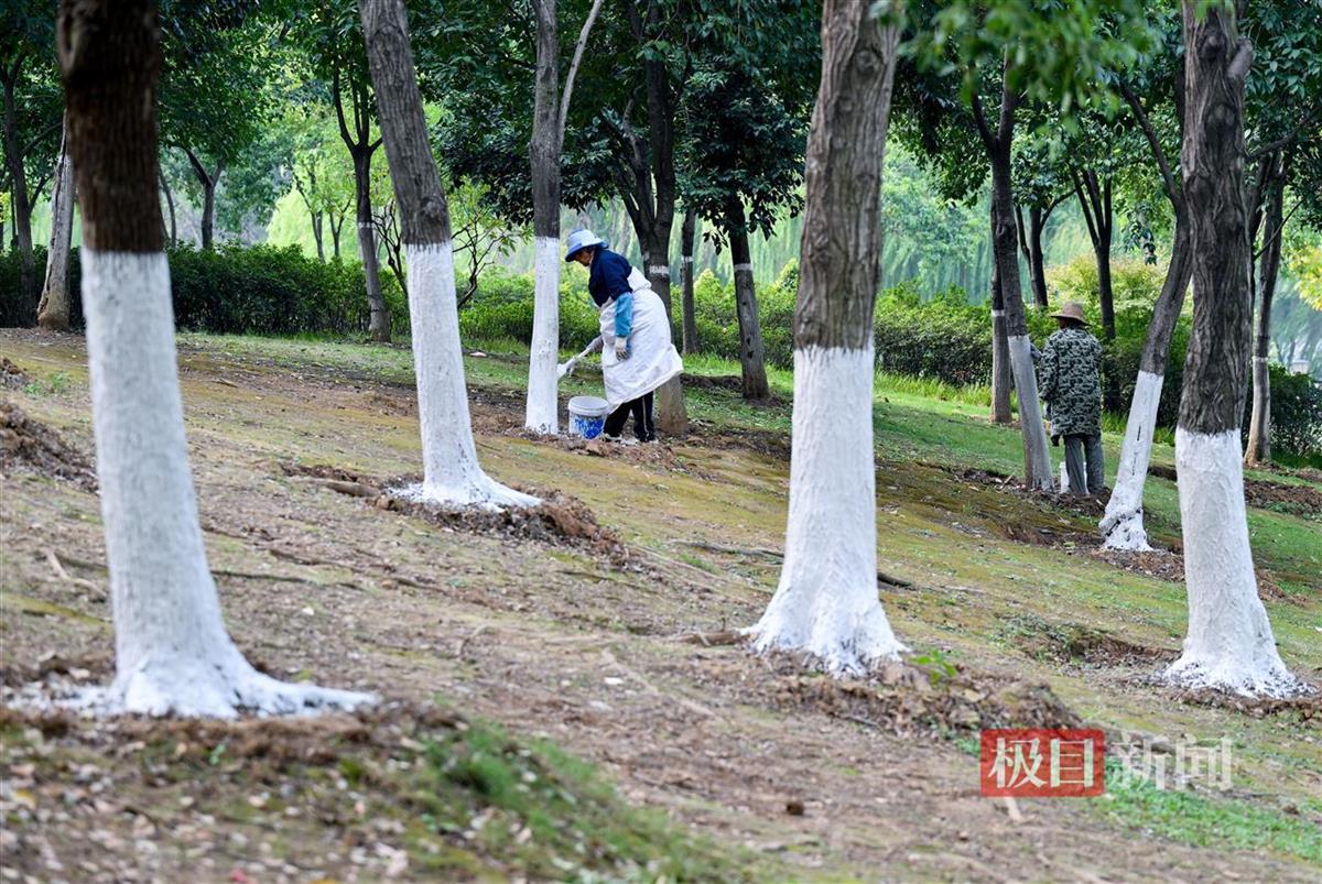 现场工人师傅称,每年冬季来临前,他们都要给园内的树木刷上石灰水。
