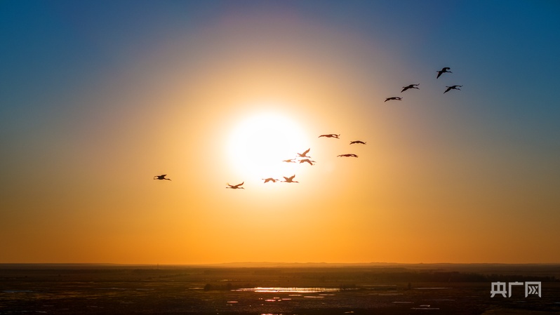 南迁候鸟在落日余晖下飞向越冬地(宝音德力格尔摄)