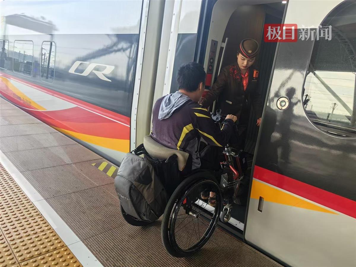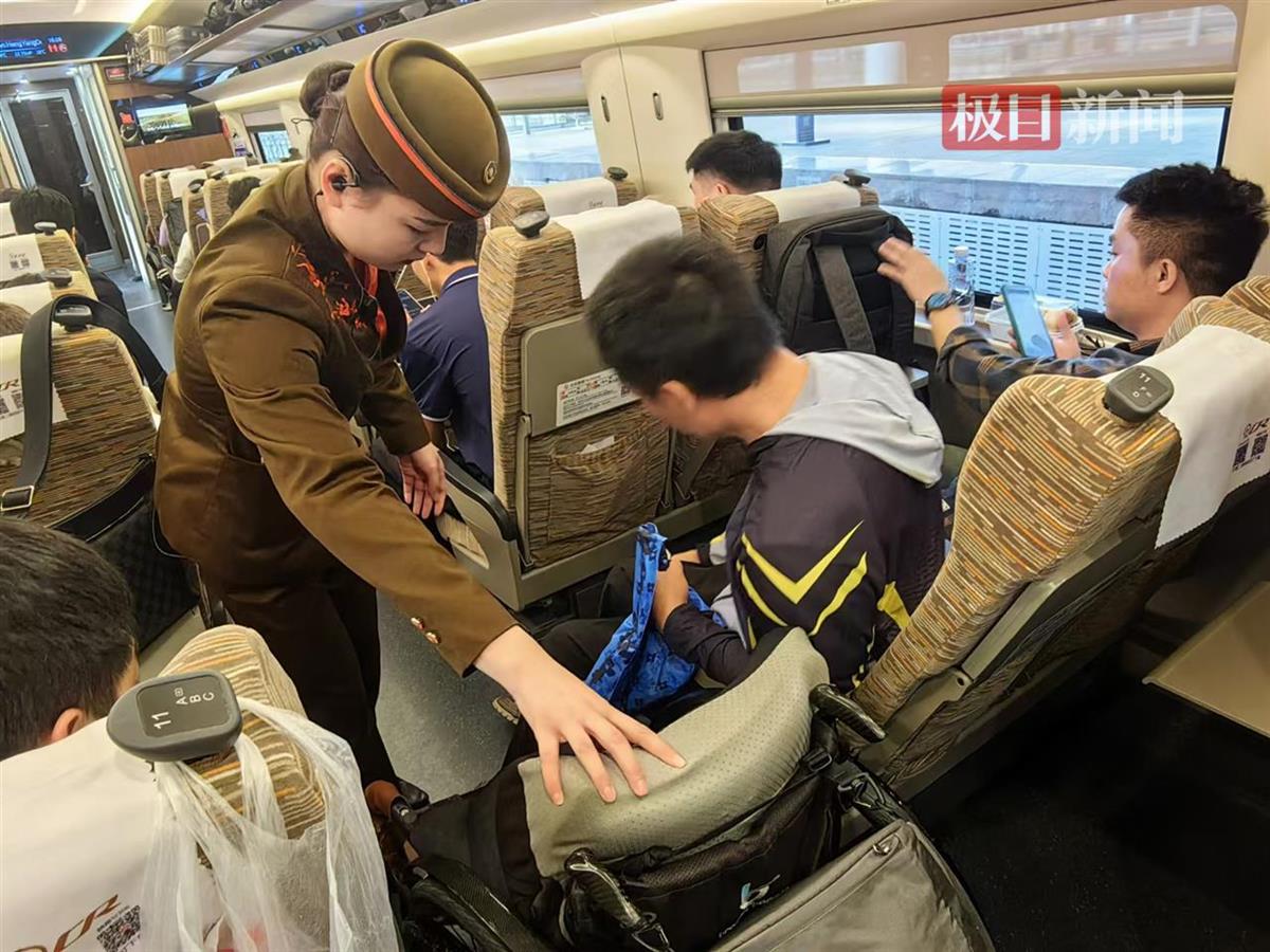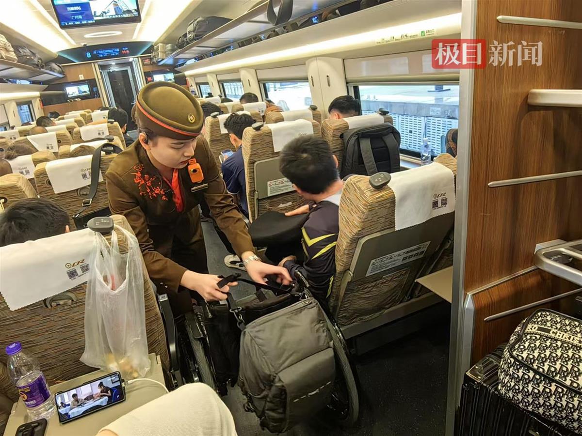 了解到这个情况后,王妍便立即进入车厢帮助张先生协商更换座位,并协助引导他就座,将张先生的电动轮椅安放稳妥。从广州南站开车后,列车员王妍为张先生送去一杯温水,并为他介绍车厢内的设施设备,考虑到张先生是一个人坐车,王妍便贴心地为他预约了武汉站的帮扶出站服务。
