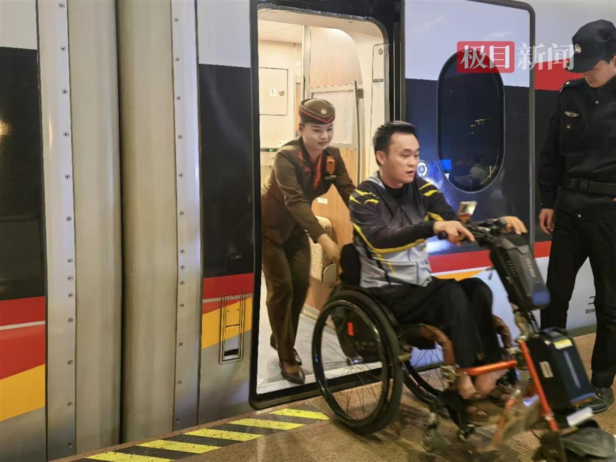 武汉站到站前,王妍提醒张先生下车,并协助他安装好电动轮椅。张先生下车后再次向列车员王妍表示感谢,并对列车工作人员的服务表示高度肯定。