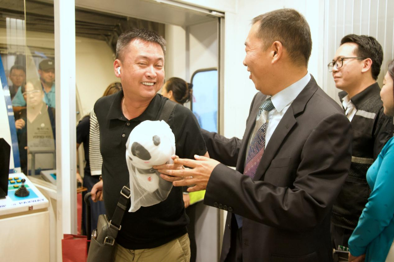 10月27日,在越南河内内排国际机场,踏出该航班舱门的首位旅客获赠“胖安达”大熊猫布偶纪念品。记者胡佳丽摄
