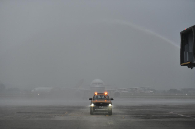 10月27日,越南河内内排国际机场以“水门礼”欢迎国航上海-河内CA755/6首航航班。记者胡佳丽摄