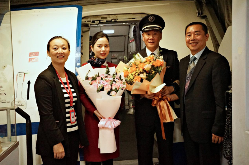 10月27日,在越南河内内排国际机场,国航上海-河内CA755/6首航航班机组人员获赠鲜花。记者胡佳丽摄