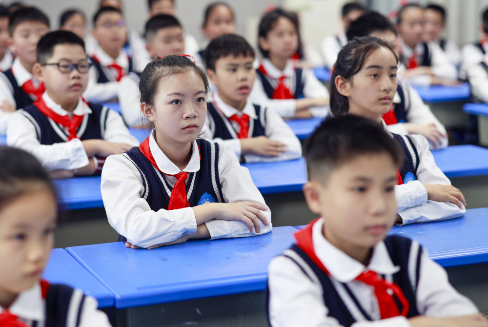 10月31日,重庆市九龙坡区重庆铁路小学的教室内,学生们聆听建筑设计师讲解各式城市建筑。新华社记者 刘潺 摄
