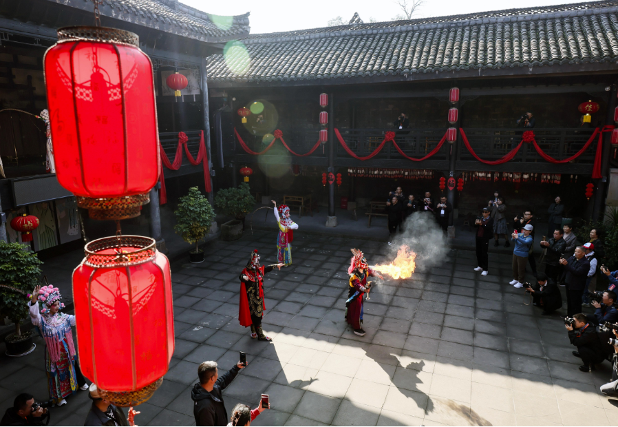 11月5日,川剧演员在恩阳古镇演出。