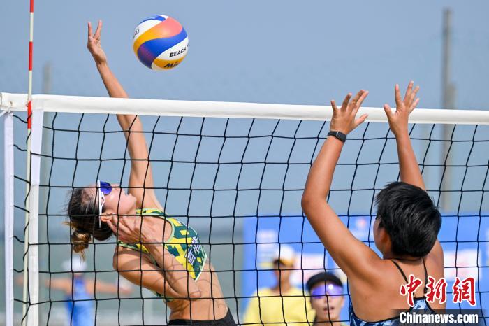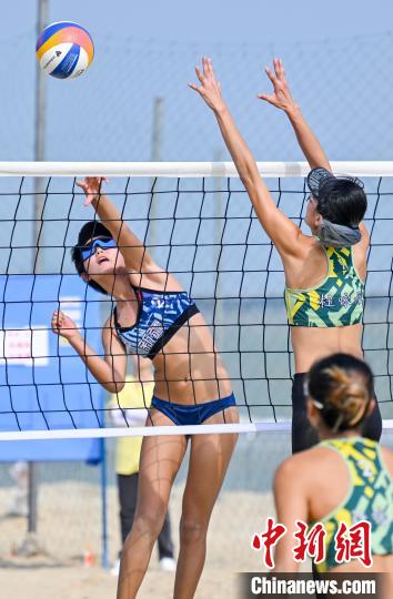 图为新疆旺源三队选手美克丽亚(左一)网前扣杀。