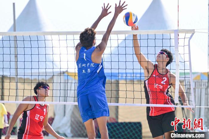 图为辽宁四队选手薛麒龙与安徽三队选手王昂(蓝衣)网前对抗。