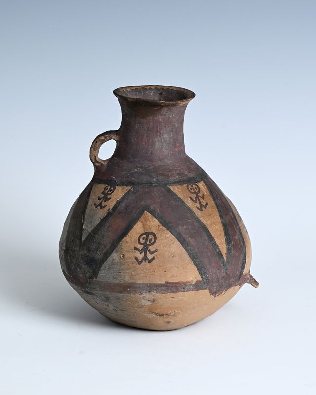 折带人形纹高低耳彩陶壶(11月5日摄)。新华社记者李贺摄