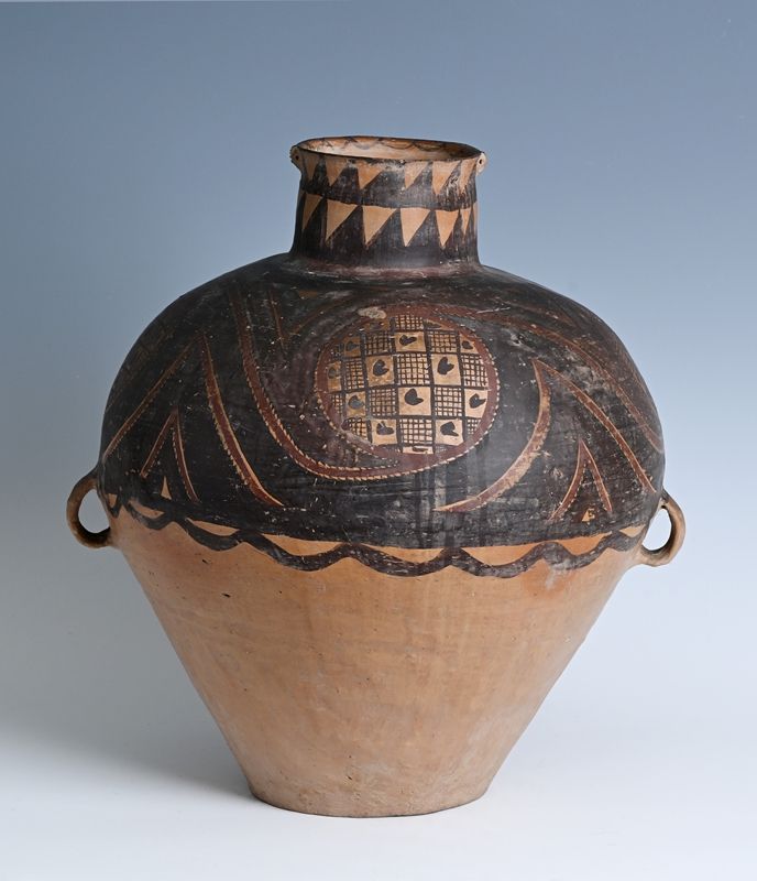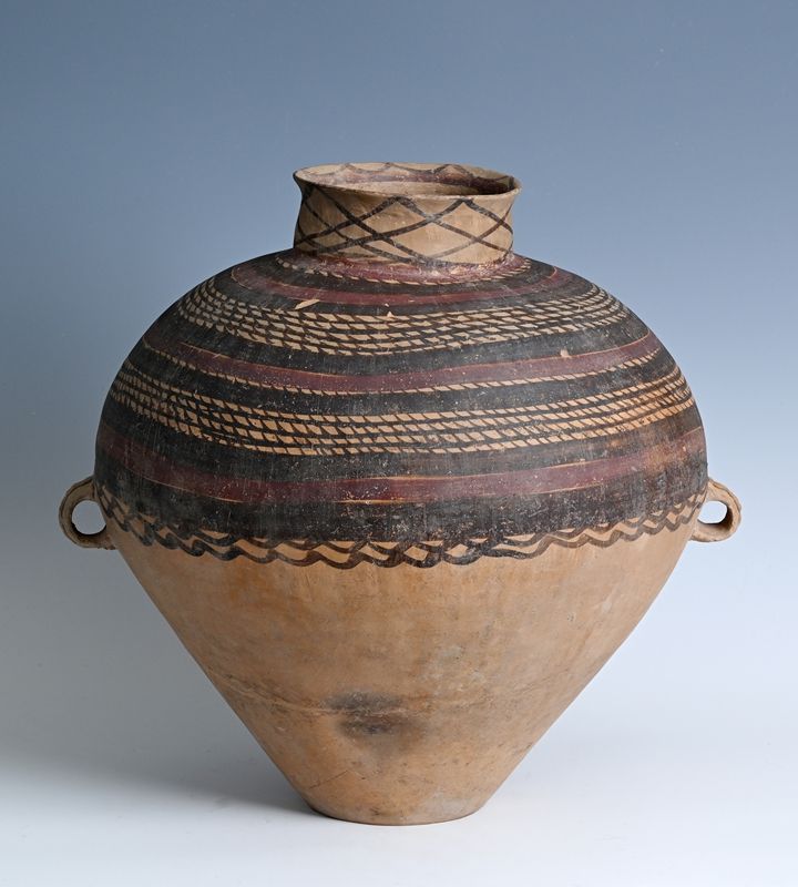 旋涡方格网纹双耳彩陶壶(11月5日摄)。新华社记者李贺摄