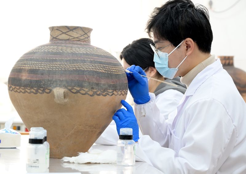 11月5日,在中国文化遗产研究院陶瓷金属文物修复室内,专业技术人员在对彩陶文物进行修复。新华社记者李贺摄