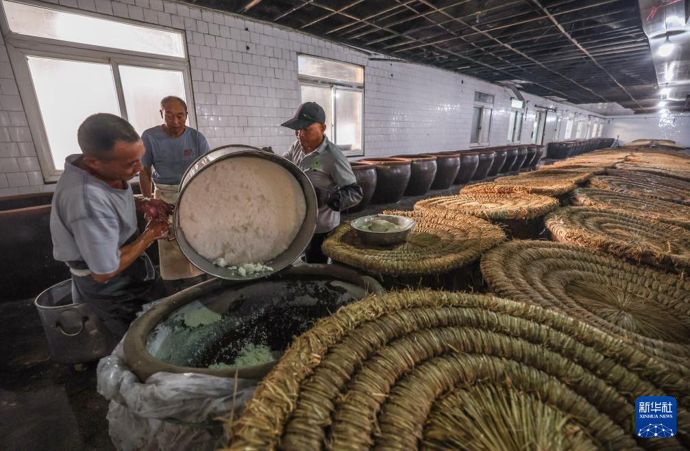 11月9日,在嘉兴市海盐沈荡酿造有限公司的酿酒车间内,酿酒师傅把蒸煮好的糯米倒入酒缸,拌匀搭窝,进入发酵流程。