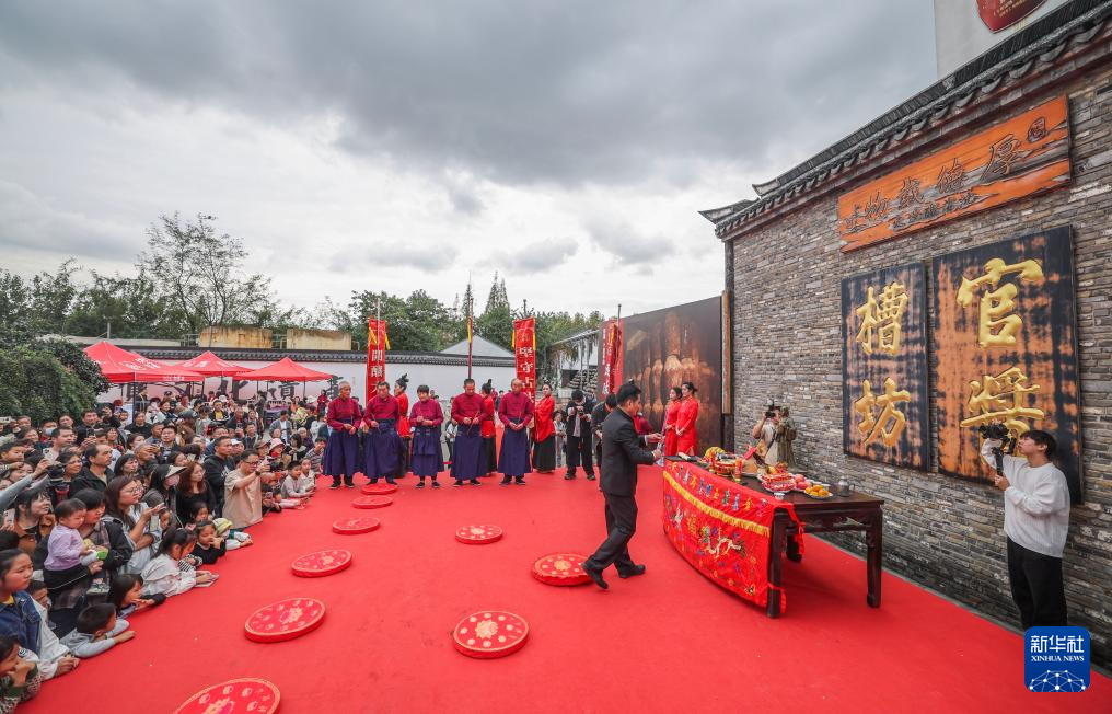 这是11月9日在嘉兴市海盐沈荡酿造有限公司内拍摄的立冬黄酒开酿仪式现场。