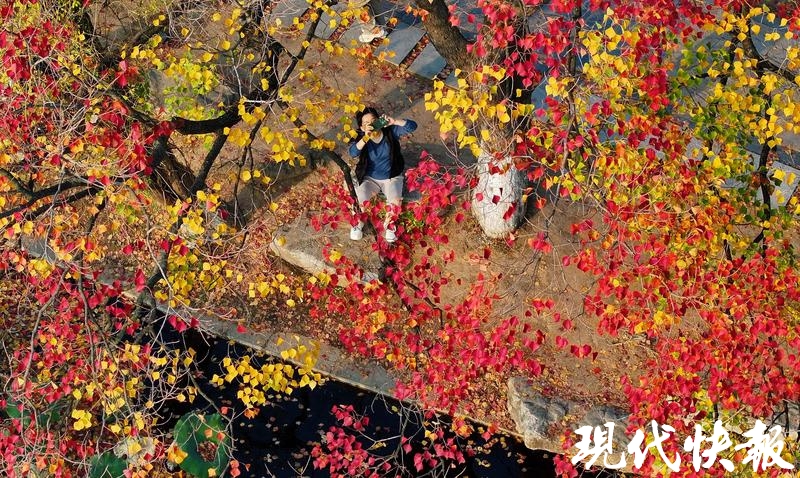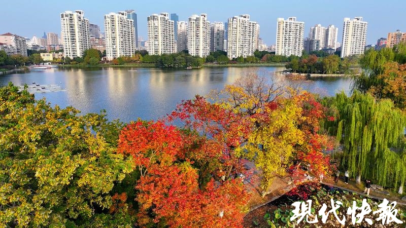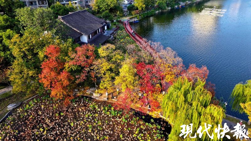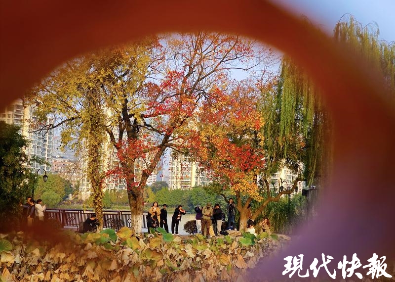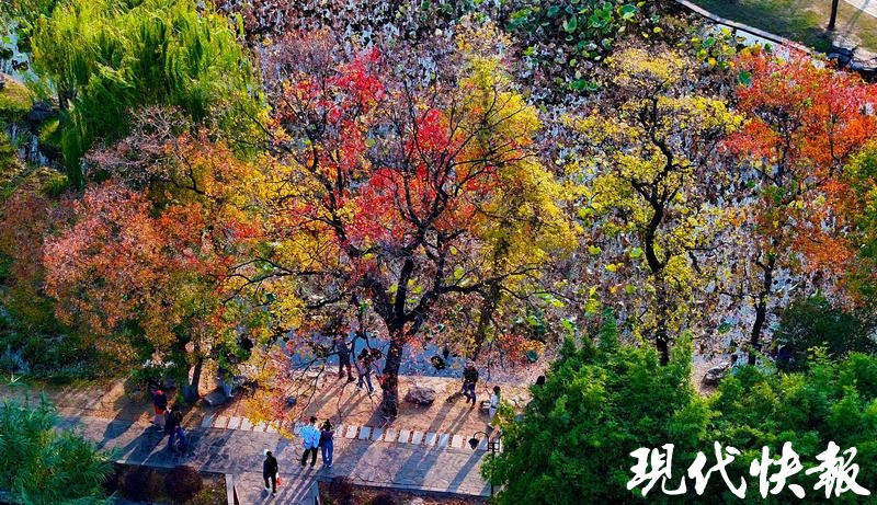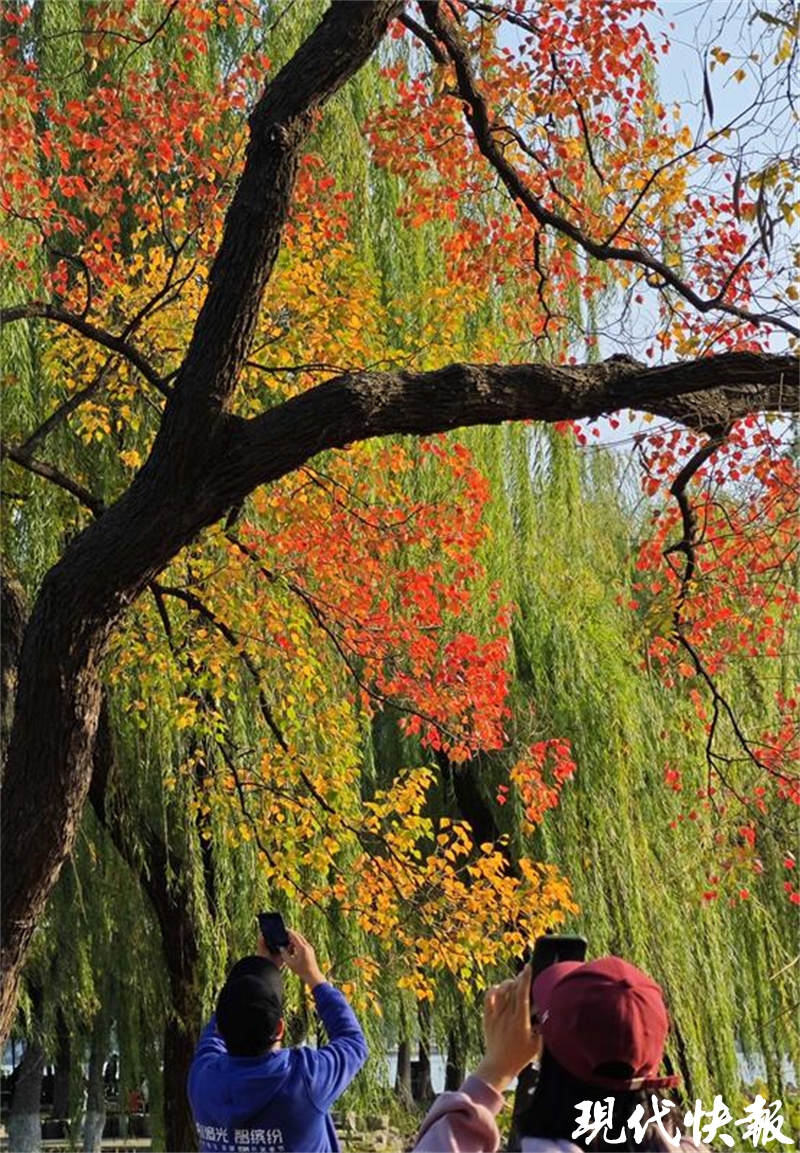 现代快报讯(记者 卢河燕/文 赵杰/摄)浅黄、橙黄、青绿、鲜红、暗红,南京莫愁湖景区内,一棵棵临水而居的乌桕,演绎了秋末冬初的斑斓。
