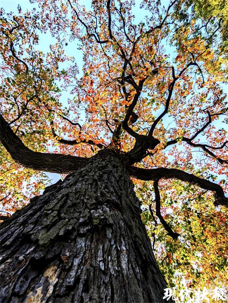 “此间好景无人识,乌桕经霜满树红。”驻足乌桕树前,满树的黄红色叶片簇拥在一起,纯粹、明媚、洒脱,在阳光的照射下美不胜收。市民和游客从它附近经过,都忍不住停留、拍照。