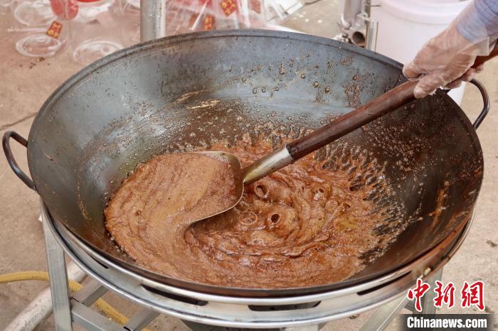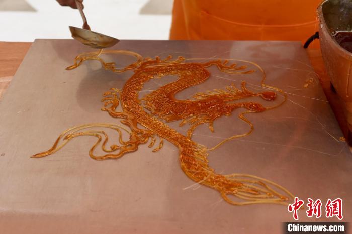 11月13日,工作人员用熬制好的红糖做糖画。糖蔗是浙江义乌红糖的原料,其生产核心区域位于该市义亭镇。该镇榨糖历史400多年,有关制糖技艺被列入中国国家级非物质文化遗产,眼下正值丰收季,现场一片忙碌。 中新社 记者 董易鑫 摄