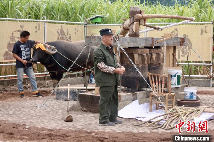 11月13日,工作人员“还原”古法榨糖的场景。糖蔗是浙江义乌红糖的原料,其生产核心区域位于该市义亭镇。该镇榨糖历史400多年,有关制糖技艺被列入中国国家级非物质文化遗产,眼下正值丰收季,现场一片忙碌。 中新社 记者 董易鑫 摄