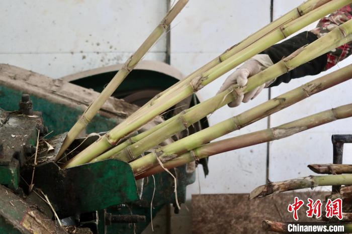 11月13日,工人将冲洗好的糖蔗送入压榨机。糖蔗是浙江义乌红糖的原料,其生产核心区域位于该市义亭镇。该镇榨糖历史400多年,有关制糖技艺被列入中国国家级非物质文化遗产,眼下正值丰收季,现场一片忙碌。 中新社 记者 董易鑫 摄