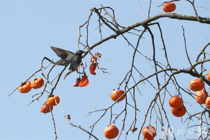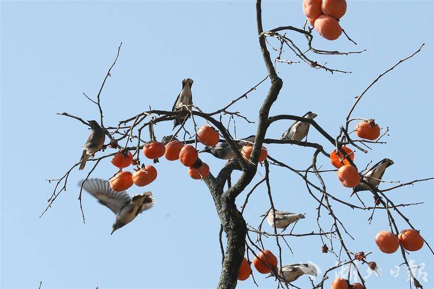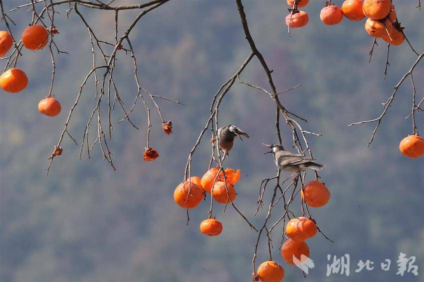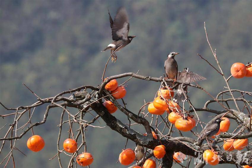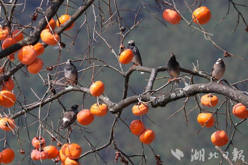 11月10日,一群灰椋鸟在秭归县九畹溪镇桂垭村的柿子树上觅食嬉戏。初冬时节,位于三峡库区湖北省宜昌市秭归县山上的柿子红了,吸引各种小鸟在柿树上觅食嬉戏,给宁静的乡村增添了不少喜乐气氛。(湖北日报通讯员 王罡 胡文庭 摄)