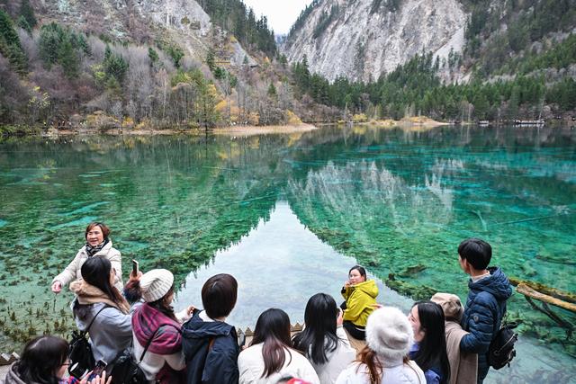 11月16日,游客在九寨沟景区五花海合影留念。新华社记者 刘莲芬 摄