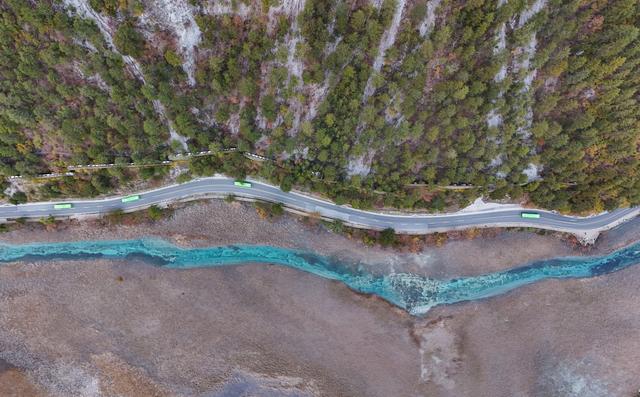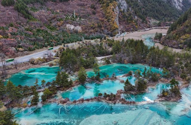 11月16日,观光车行驶在九寨沟景区芦苇海旁的公路上(无人机照片)。新华社记者 王曦 摄