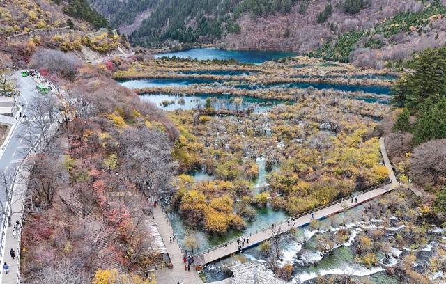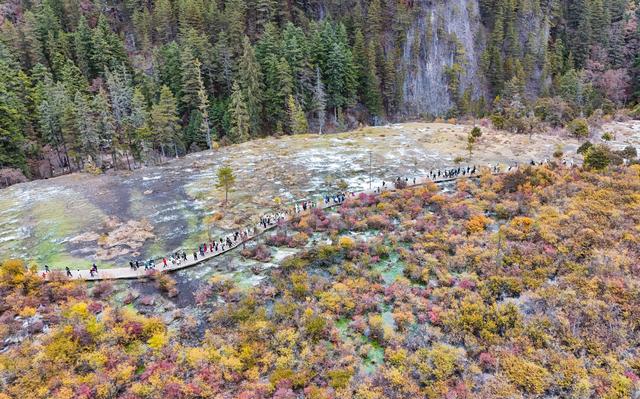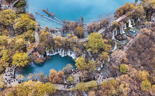11月16日,游客在九寨沟景区树正群海观光(无人机照片)。新华社记者 刘莲芬 摄