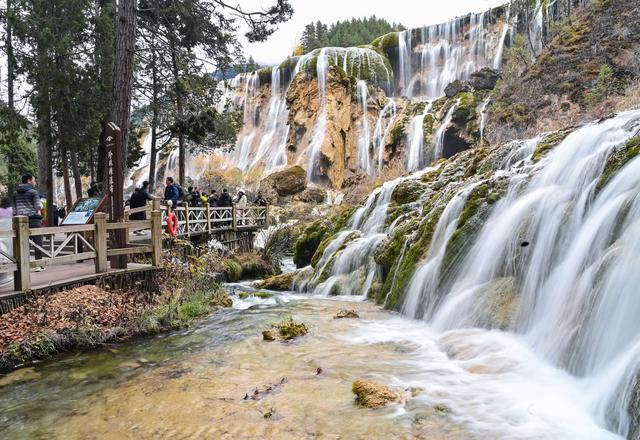 11月16日,游客在九寨沟景区珍珠滩瀑布观光。新华社记者 刘莲芬 摄