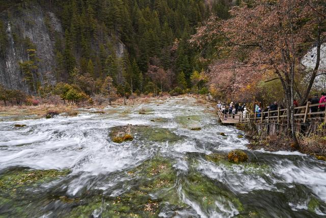 11月16日,游客在九寨沟景区五彩池观光。新华社记者 刘莲芬 摄