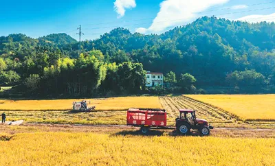 日前,在湖北省黄冈市英山县方家咀乡望天畈村,农户进行晚稻收割作业。王江摄(人民视觉)