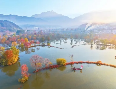 立冬临近,湖北省黄冈市罗田县九资河镇红叶观赏带,乌桕树叶灿烂如霞,吸引了众多游客前来观赏。王江摄(人民视觉)