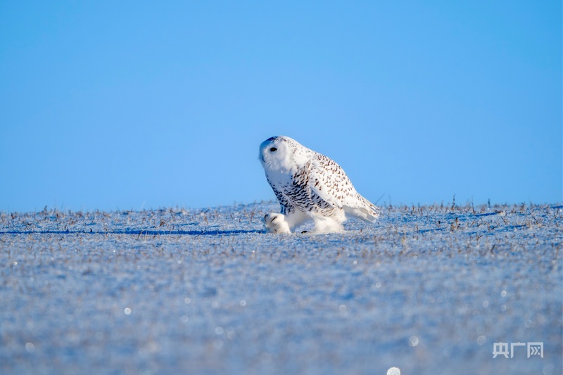 雪鸮在新巴尔虎右旗的草原上栖息(央广网发田昊霖摄)