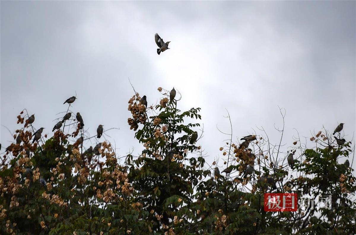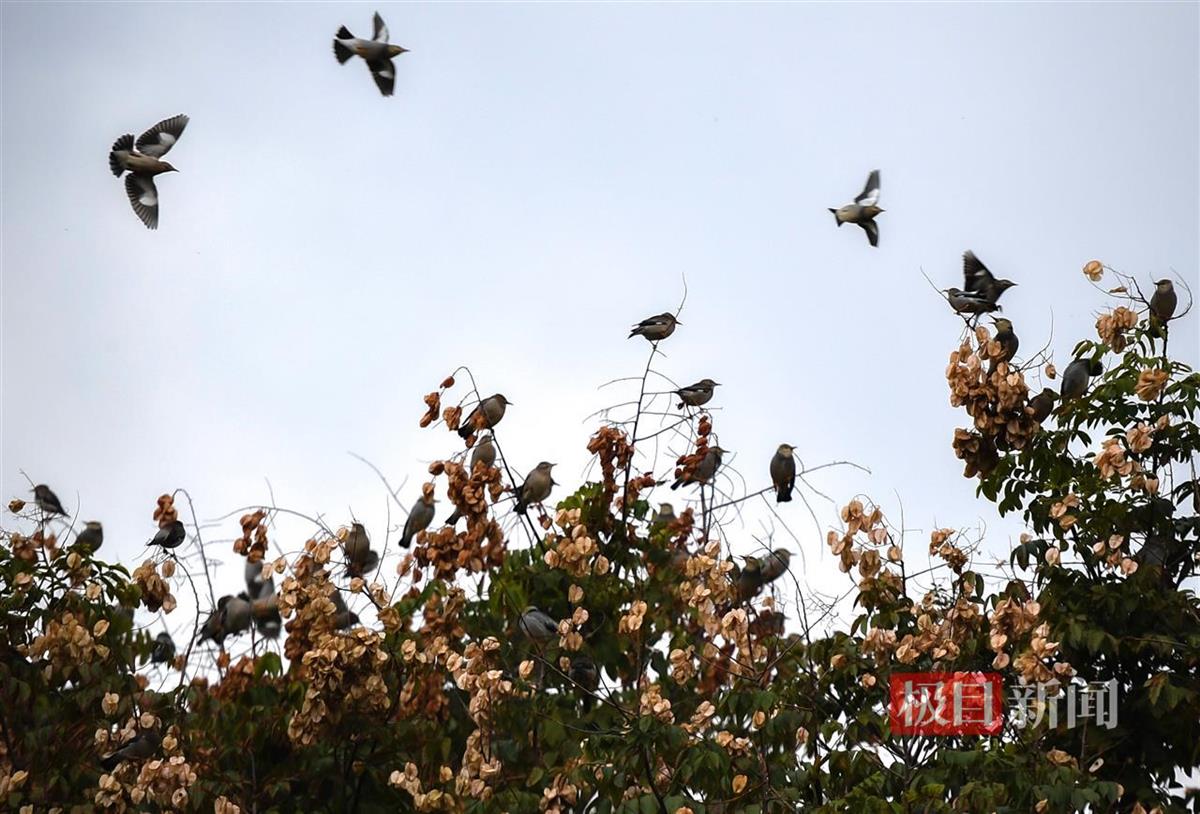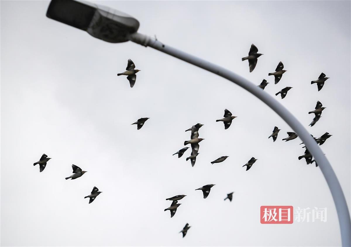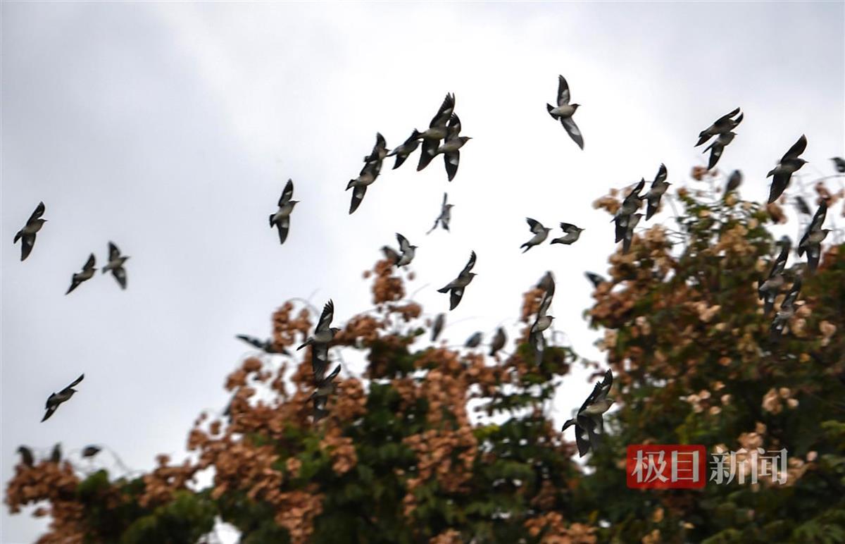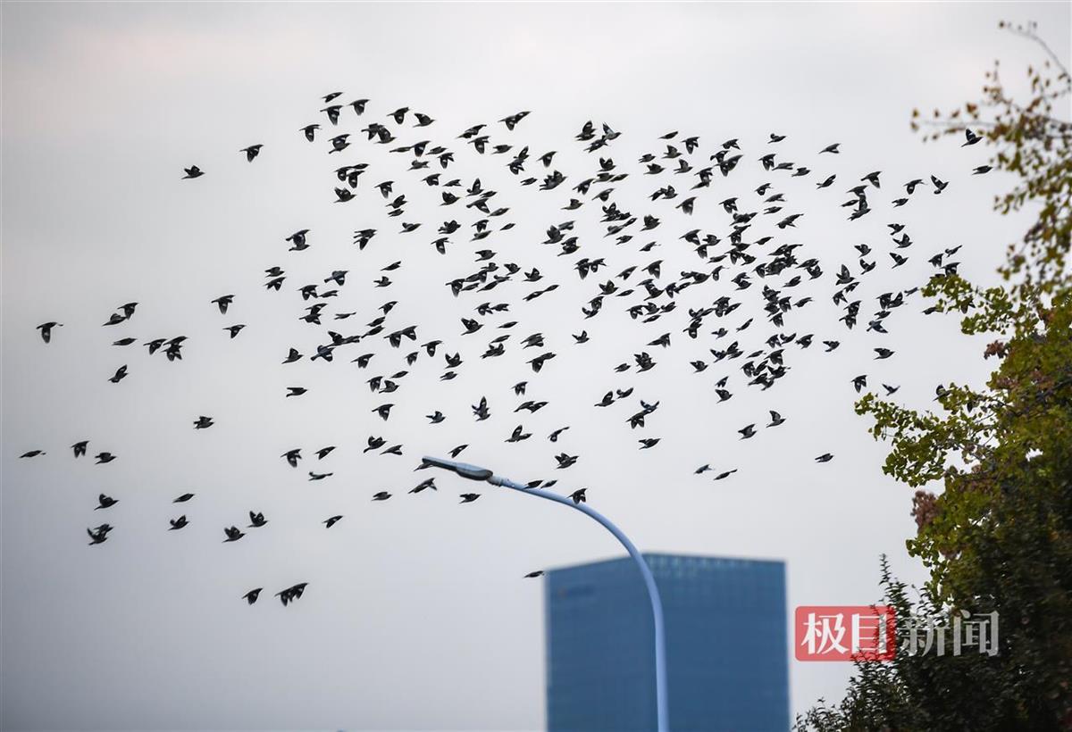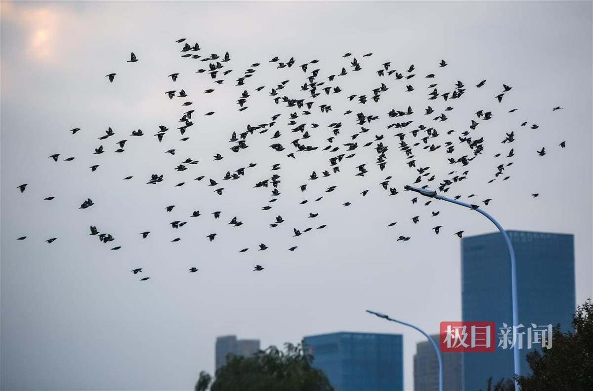 公园上空出现了令人震撼的一幕。成群结队的鸟儿在空中飞舞,它们或盘旋、或俯冲,场面蔚为壮观。这些耐不住性子的冬候鸟与外出觅食的留鸟交织在一起,形成了密密麻麻的鸟阵,在都市丛林的映衬下,这一景象更显得震撼人心。