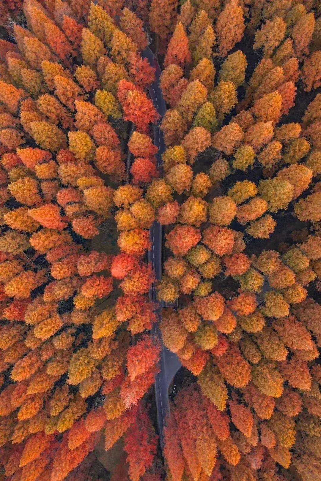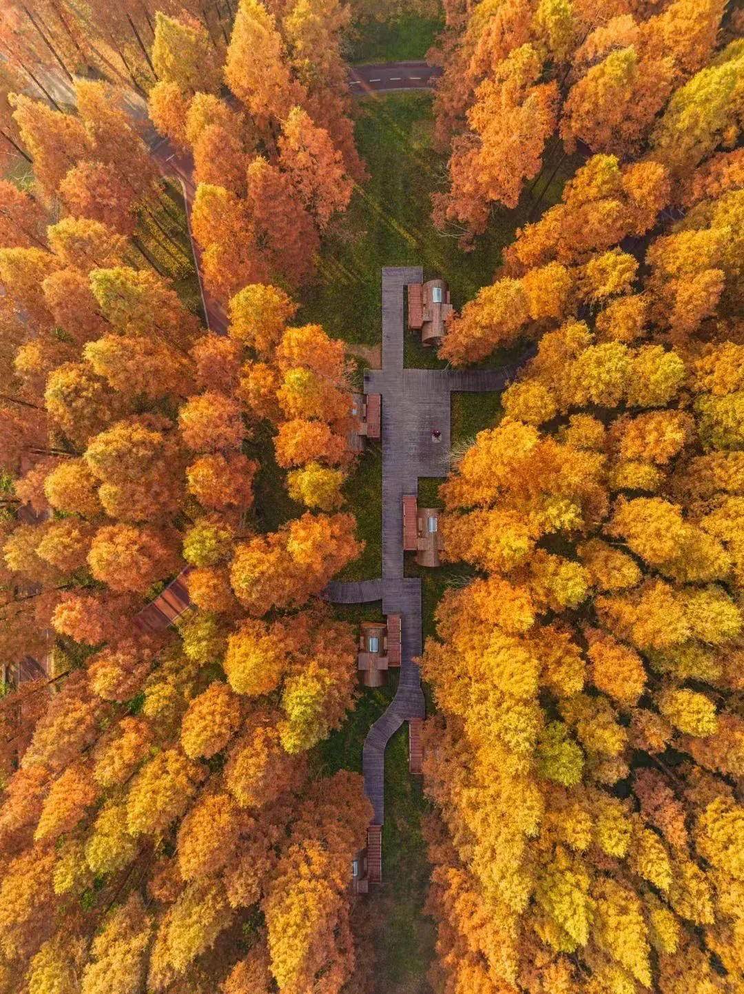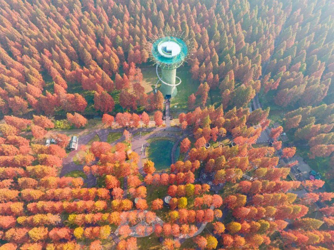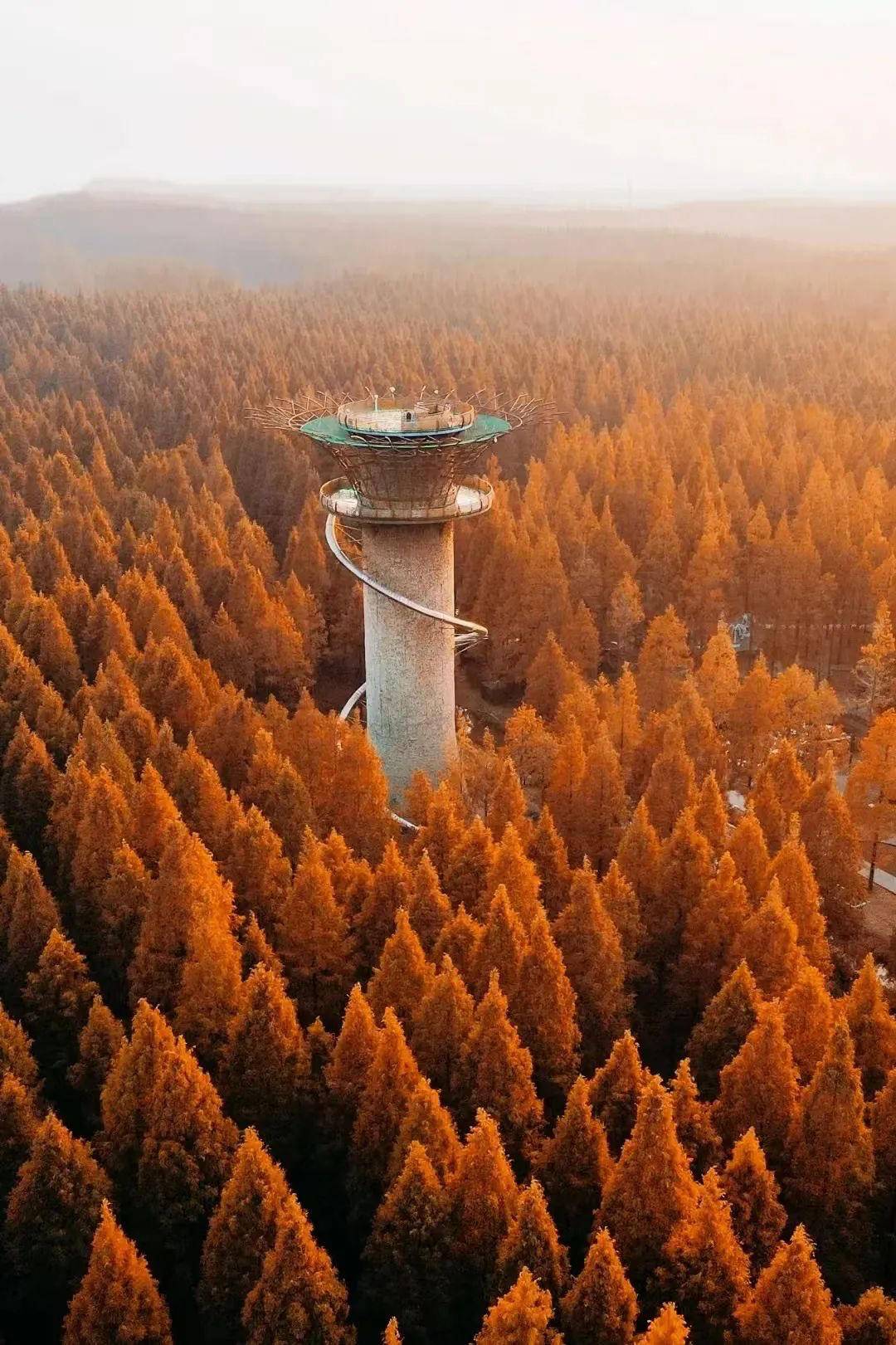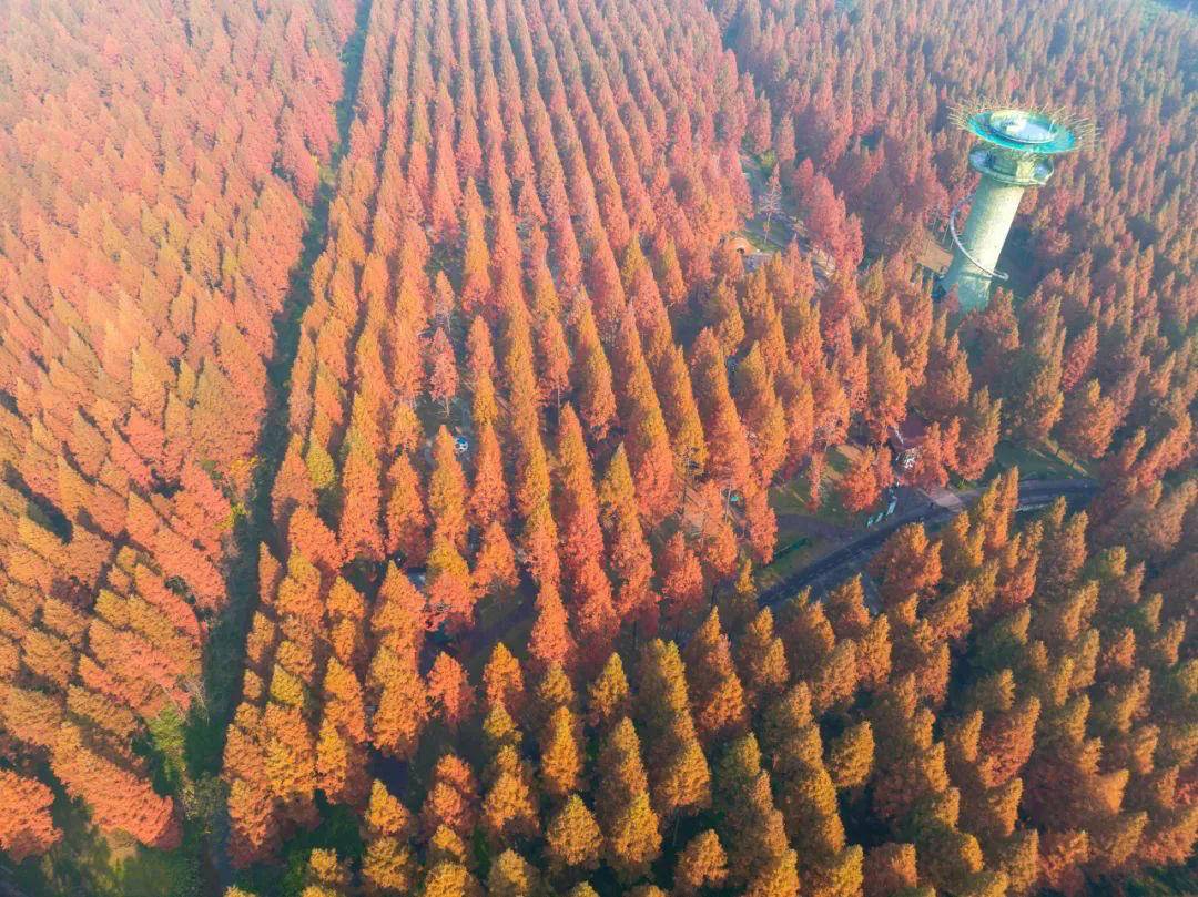 黄海森林的水杉树叶红似火,黄如金,风景如诗如画,令人沉醉。站在森林之眼之上,俯瞰整片杉树林,好似一片橙红色的海洋。