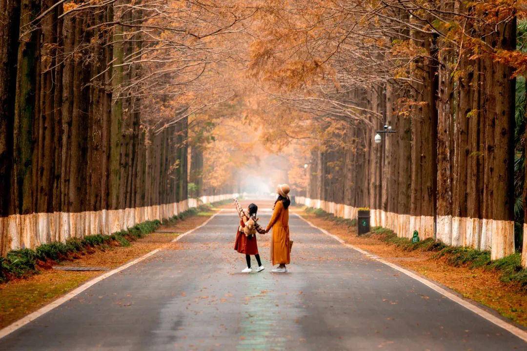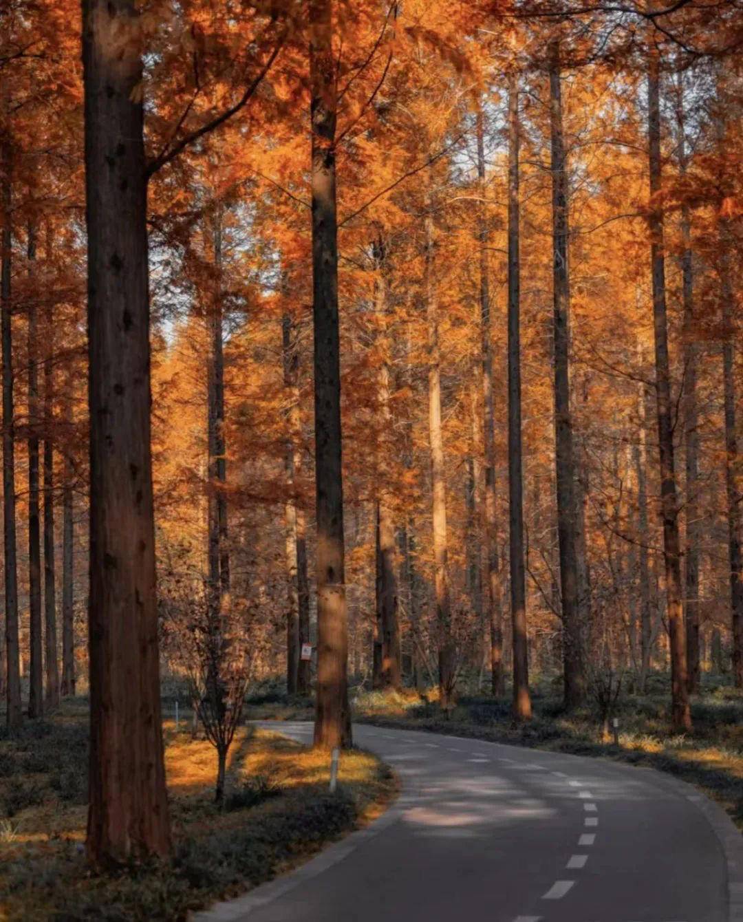 在黄海森林的怀抱中,笔直的水杉树如忠诚的卫士整齐地列队于大道两侧,向远方无限延展,勾勒出一幅动人心魄的秋日画卷。