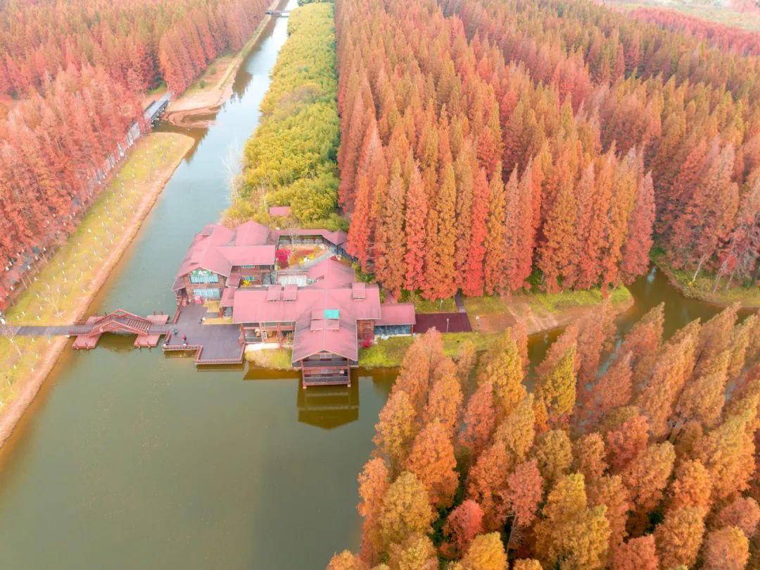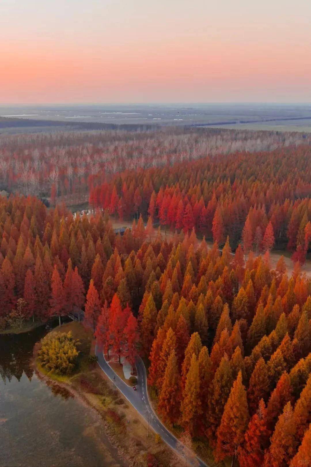 沿着黄海1号公路一路向南 就可以进入童话般的红色水杉林。拍照打卡必不可少,本文为你推荐8处打卡点,助你咔咔拍大片。