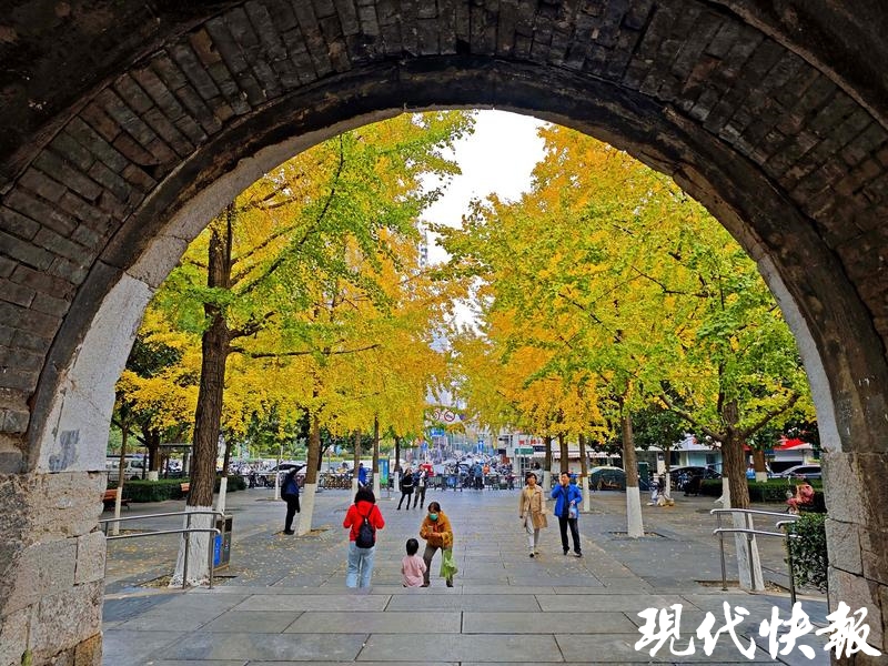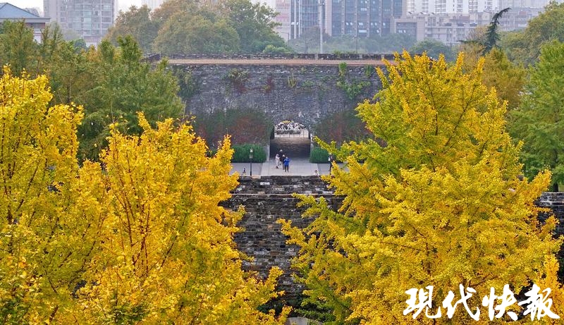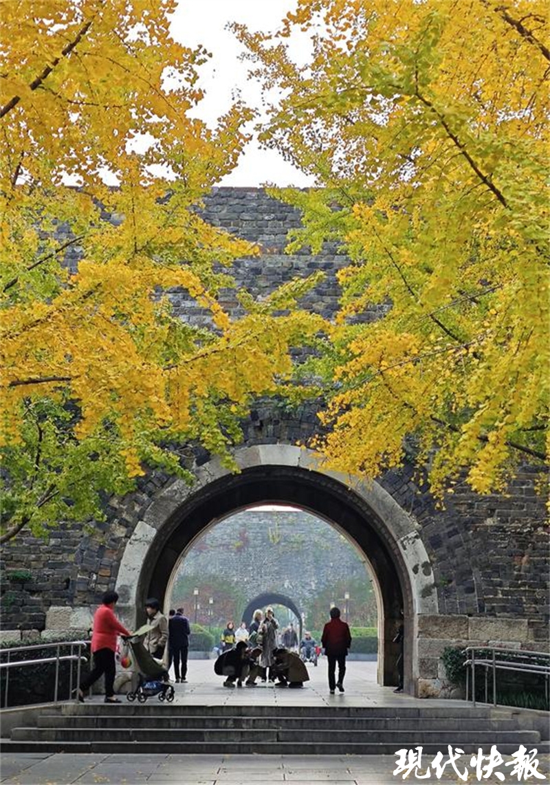 在南京汉中门广场,银杏树在暖阳下呈现一片金黄,与沧桑的城墙相互映衬。