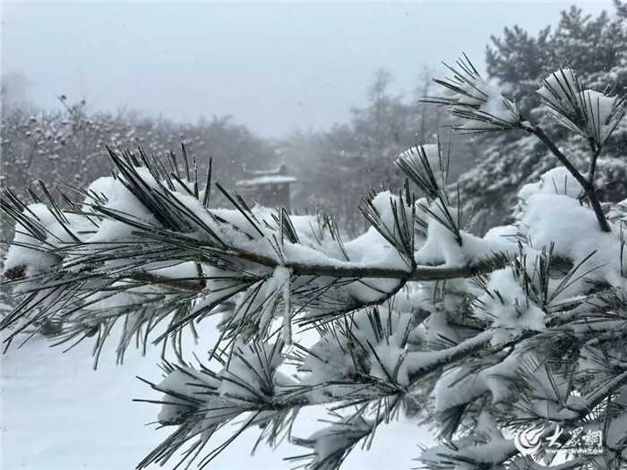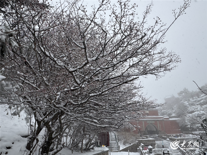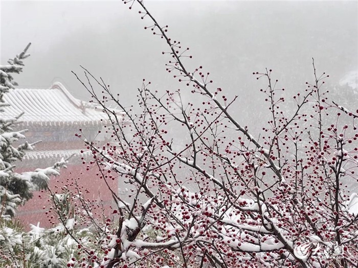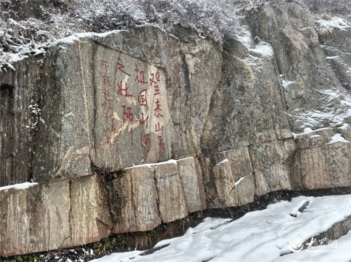 纷纷扬扬的雪花从天而降,漫山玉树琼枝、如诗如画,古建筑群、石刻与白雪交相辉映,演绎出一首冬日恋歌。