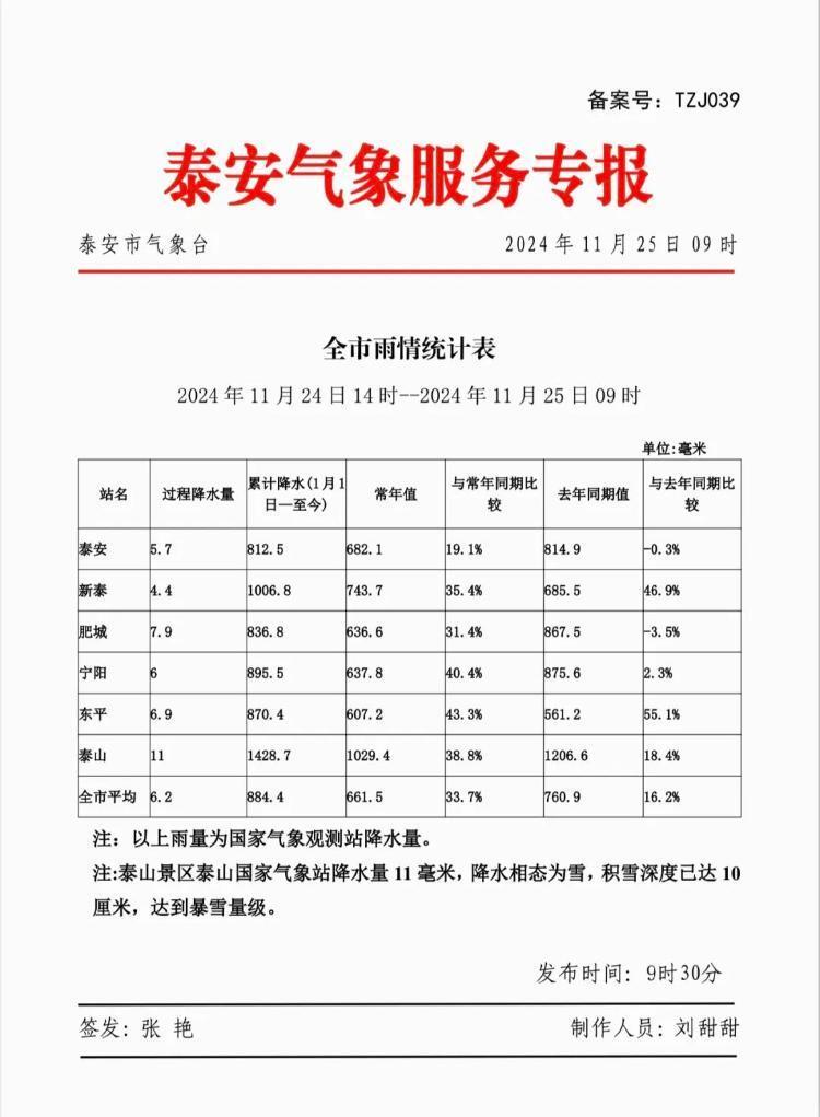 泰安市气象台11月25日9时发布全市雨情统计表,2024年11月24日14时——2024年11月25日9时,泰山景区泰山国家气象站降水量11毫米,降水相态为雪,积雪深度已达10厘米,达到暴雪量级。