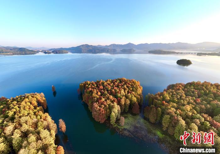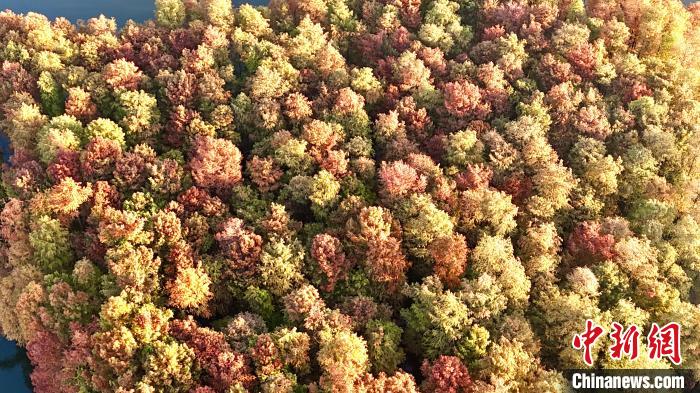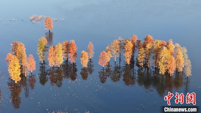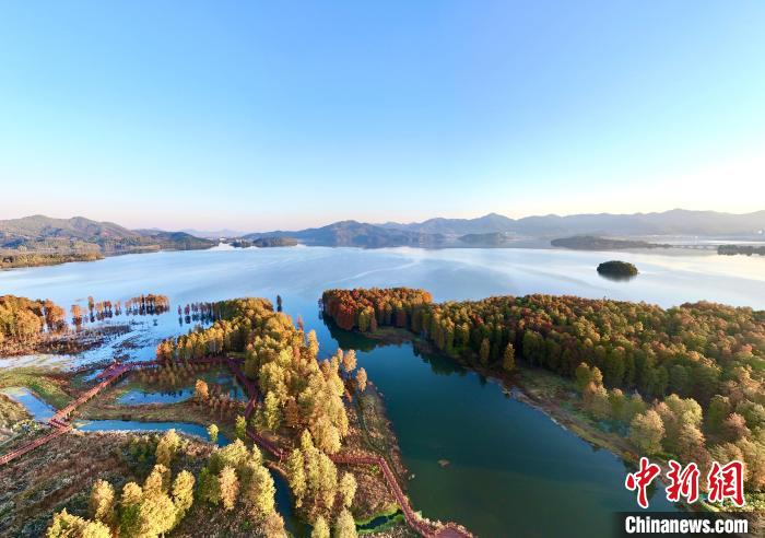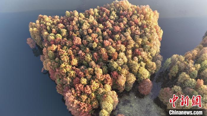 12月1日,浙江宁波余姚梁弄四明湖池杉林正日益转“红”。从空中俯瞰,这片多彩的网红打卡地正进入最佳观赏期。连日来,天气晴好,各地游客纷至沓来,争相目睹这片池杉林美丽的冬日景色。