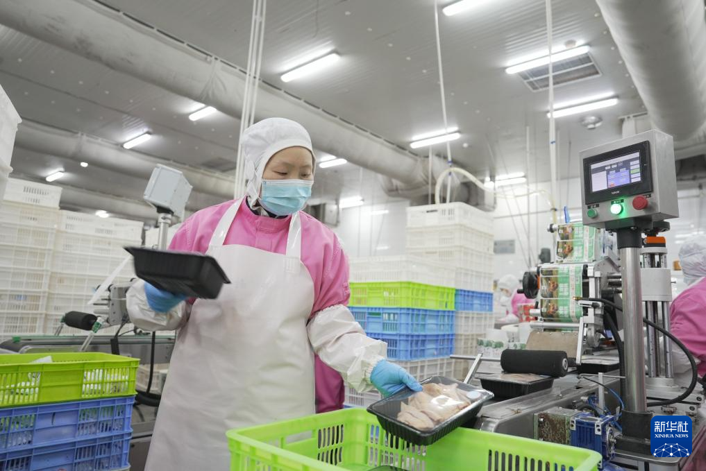 11月29日,在石门县一家家禽加工企业冷链车间,工人在包装鸡肉。新华社记者戴斌摄