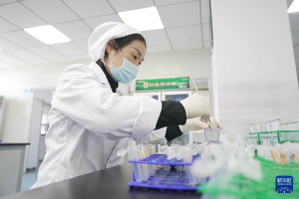 11月29日,在石门县一家家禽加工企业实验室,工作人员对鸡肉样本进行抽检。新华社记者戴斌摄