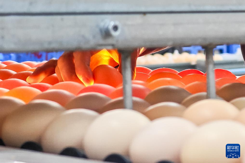 11月29日,在石门县一家家禽加工企业码蛋车间,工作人员在挑选鸡蛋。新华社记者陈思汗摄