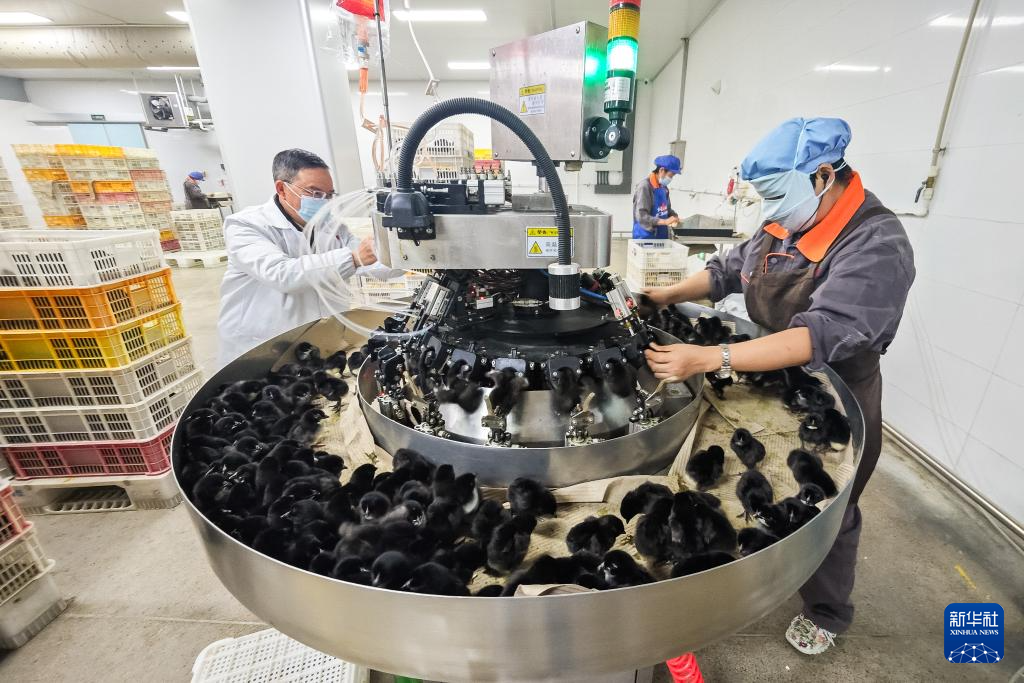 11月29日,在石门县一家家禽加工企业鸡苗处理车间,工作人员使用自动化设备给雏鸡打疫苗。新华社记者陈思汗摄