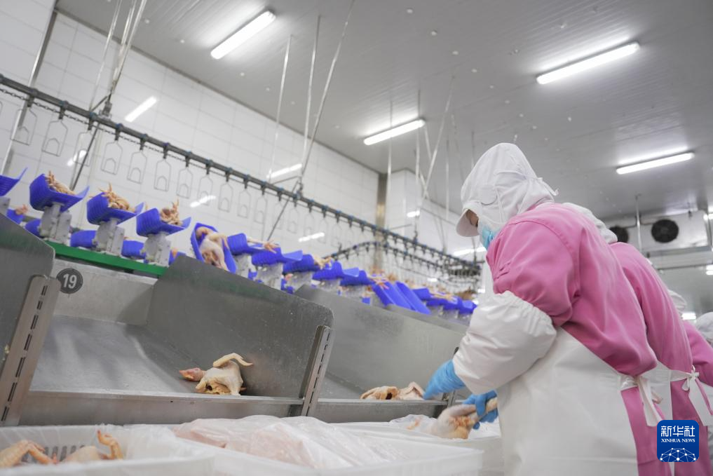 11月29日,在石门县一家家禽加工企业冷链车间,工人在分装白条鸡。新华社记者戴斌摄