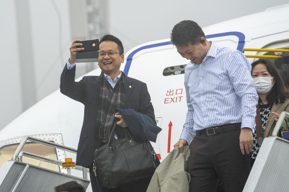 12月3日,搭乘国产大飞机C919重庆首个商业航班首航客机的旅客,在下机后兴奋地用手机进行自拍。新华社记者 刘潺 摄