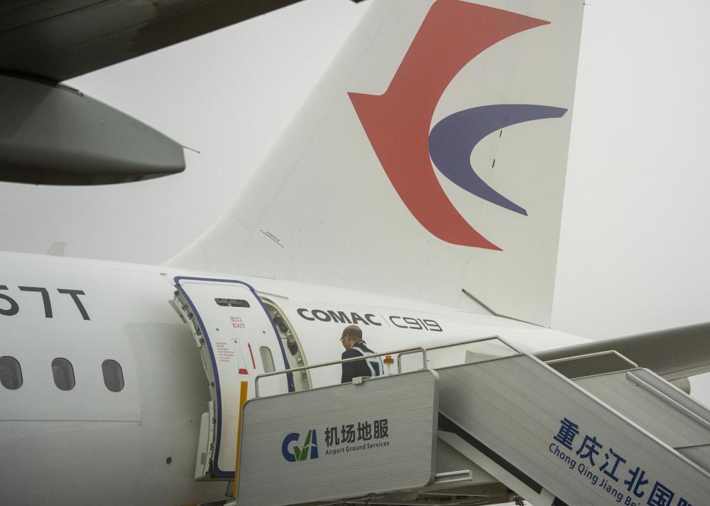 12月3日,在重庆江北国际机场停机坪上,机场地勤工作人员通过C919大型客机尾部舱门有序进入机舱进行作业。新华社记者 刘潺 摄