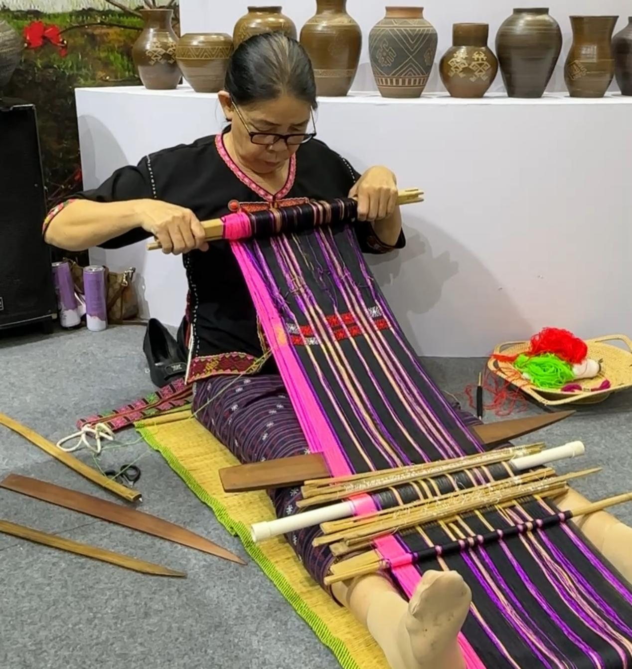 东方馆,黎族阿婆展示如何用腰织机织黎锦(央广网记者 蔡文娟 摄)
