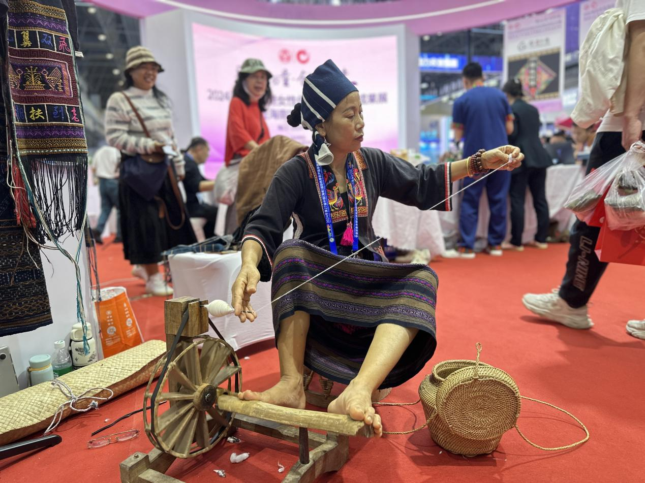 冬交会现场,黎族阿婆使用手捻纺锤和单锭脚踏纺车纺纱(央广网记者 蔡文娟 摄)