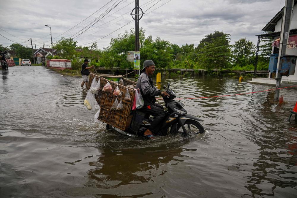 12月9日,在印度尼西亚东爪哇省莫佐克托的一座村庄,一名男子骑摩托车涉水出行。新华社/法新